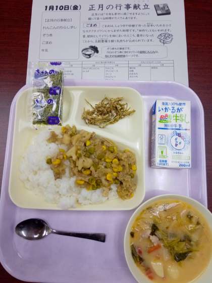 今日のメニューは「正月の行事献立」で、「ごまめ」も行事食のひとつです。