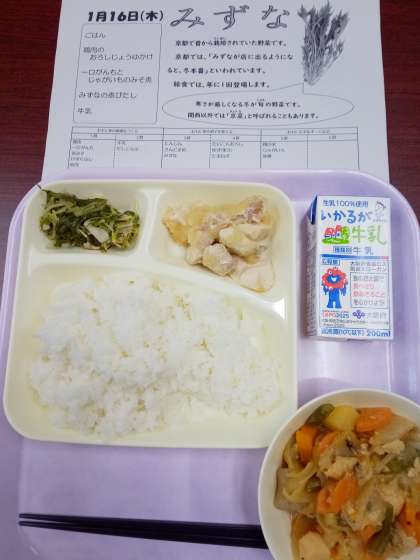 今日の献立の「がんも」とは「がんもどき」の略で、水気をしぼった豆腐にすったヤマイモ・ニンジン・ゴボウ・シイタケ・コンブ・ギンナンなどを混ぜ合わせて丸く成型し、油で揚げたものです。