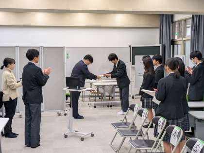 オンラインにて行われました。まず野球部、吹奏楽部の表彰伝達の後、2年生マラソン大会での上位入賞者の報告がありました。次に学校長より講話があり、内容は「試す」について考えようとのことでした。3年生は目前の「入試」で、当日の試験だけでなく、終わった後からが大切で、次のステップに向けての準備をしっかり行うことや、同様のことを先日、スポーツ界で活躍される大相撲の豊昇龍やボクシングの井上尚弥選手が言っておられたとのことでした。