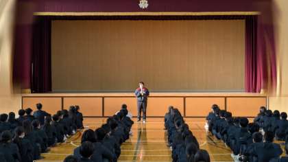 体育館で開かれ、学級代表の点呼で8時25分からスタートしました。