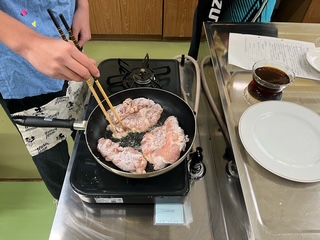 2年生は家庭科の調理実習で「チキンの照り焼き」を作っています。