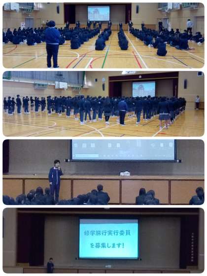 集会では、修学旅行について目的や日程等の概要が示され、ルール担当、広報担当、レク担当といった役割を担う「修学旅行委員」の募集案内がありました。