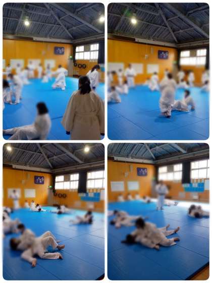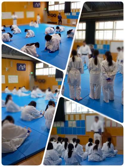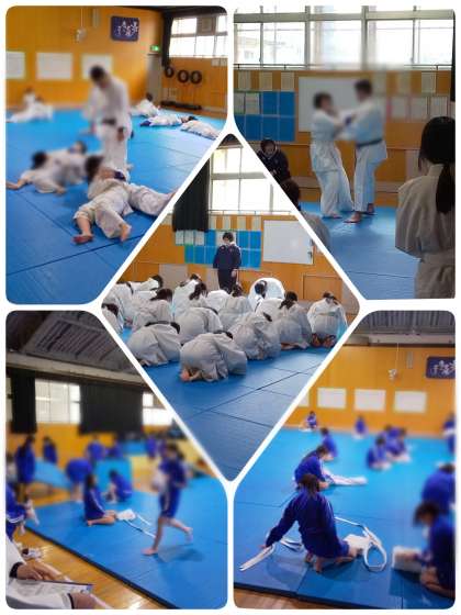 柔道の単元で、「寝技の逃げ方」に関連する動きにつながる運動について、実習に来られている大学生の先生から、ゲーム形式で楽しく教えていただきました。