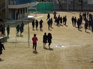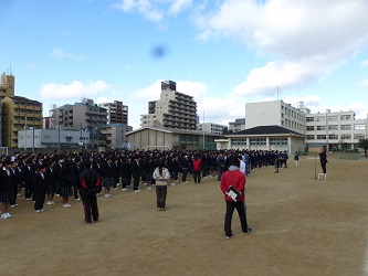 実際に事件が起こった場合、不審者がどのよう行動をとるのかは予想できません。いざという時に臨機応変に対応が取れるように、事前に教職員にも侵入場所を知らせずに行った訓練でしたが、昨年の避難訓練に比べて運動場への避難に要する時間が約1分も短縮できました。生徒たちは寒さにも負けず、頑張ってくれました。