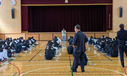 給食の後、午後からは体育館にて着こなしセミナーと部活動紹介が予定されています。