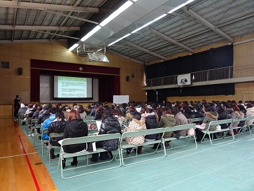 説明会では、 「学校長あいさつ」、「本校の教育方針」、「入学式等」、「特別支援教育」、「中学校の学習内容」、「中学校生活」、「学用品などの物品購入」、「中学校給食」、「学校諸費の納入方法」などについて説明を行いました。また、PTA会長から、「PTA活動」についての紹介がありました。