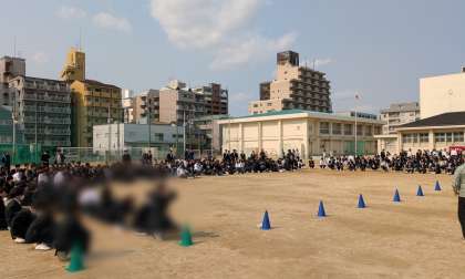 全校生徒の600名以上の生徒、教職員が、地震からの火災を想定してグラウンドに避難しました。