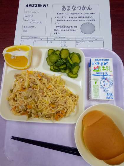 今日の「焼きそば」も、2小学校別々に作られていますので、実は麺のゆで具合や、(作り方は同じでも)仕上がり具合が異なってたりします。