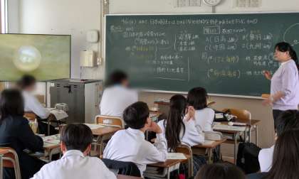 2年生社会では、教室にて、地理の学習として、日本の国土の成り立ちについて、動画資料を交えながら、先生による講話形式で行われました。