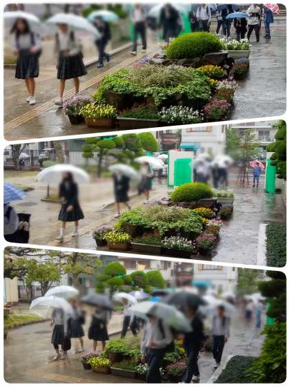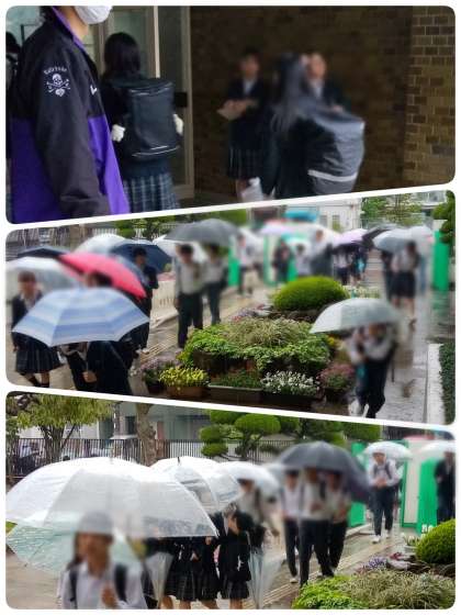 傘を持っているにも関わらず、「ひとつの傘に3人!」入りながら登校する生徒もいました。