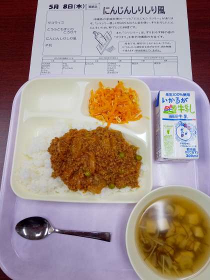 今日の「にんじんのしりしり風」は、「シリシリー器」と呼ばれるおろし金でにんじんをおろす、沖縄の家庭料理をイメージしているそうです。