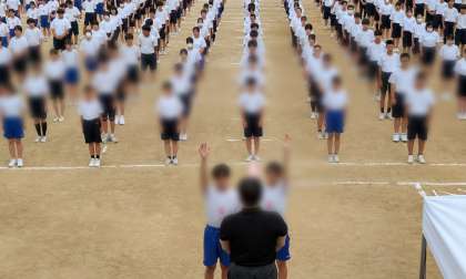 本日の午前中、グラウンドにて、全校生徒の体育大会予行が行われています。