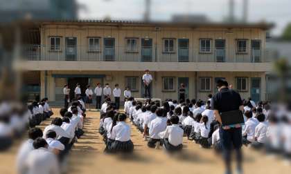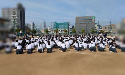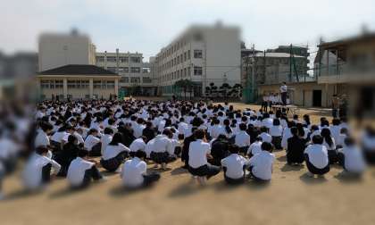 おはようございます。本日の朝、グラウンドにて全校集会が開かれました。