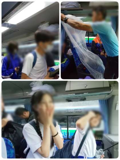 バスのシートにカバーをかけて、ラフティングの服装、ヘルメット、ライフジャケットを装着し、再びバスに乗ってスタート地点に移動します。