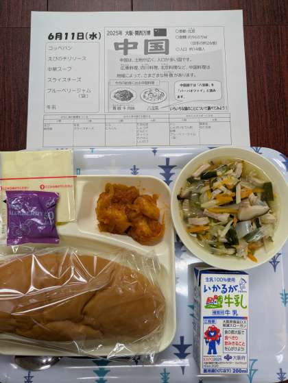 本日の献立内容は、えびのチリソース、中華スープ、スライスチーズ、ブルーベリージャム(袋)、コッペパンと牛乳です。