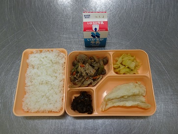 本日のメニュー:糸よりのてんぷら、豚肉と根菜の炒め煮、キャベツのごまあえ、のりの佃煮、米飯、牛乳