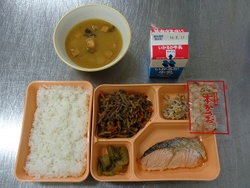 本日のメニュー:鮭の塩焼き、きんぴらごぼう、もやしのごま酢あえ、