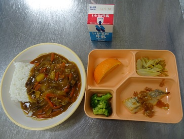 本日のメニュー:ビーフカレーライス、ブロッコリー、白身魚