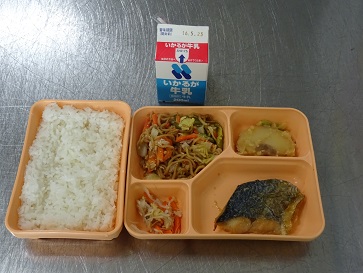 本日のメニュー:さごしのみそづけ、焼き焼きそば、じゃがいもと