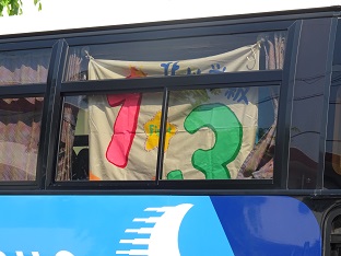 (写真下段)先日、各クラスで作成した学級旗を観光バスに掲げています。学級旗は体育大会でも使用します。