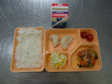 本日のメニュー:鶏肉のマヨネーズ焼き、野菜ソテー、マッシュ
