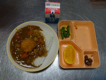 本日のメニュー:チキンカレーライス、一口とんかつ、グリーン