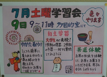 7月9日(土)に、学校元気アップ主催で「土曜自主学習会」を開催しました。自主学習会ではいつもの自主学習に加えて、「ゆかたの着付教室」と「茶道教室」を行いました。