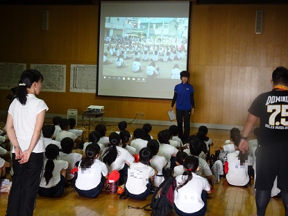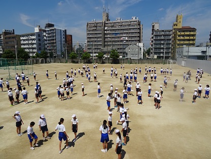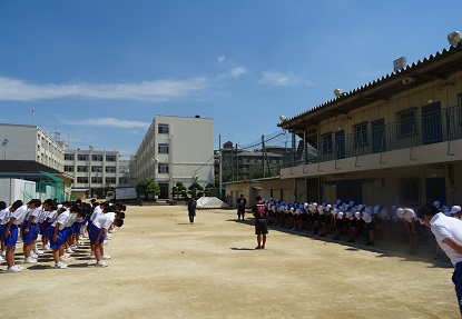 本日2・3限目に、小中連携授業として新庄小学校5・6年生が本校を訪れてくれました。新庄小学校は10月2日(日)に運動会が行われ、5・6年生は合同演技(頂)を行います。その成功に向けて、基本となる集団行動について本校体育科教員からの授業を受けました。また、3限目には運動場で中学生をリーダーとするグループ別に個別の集団行動練習や小学生による全体練習を行いました。