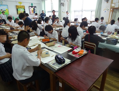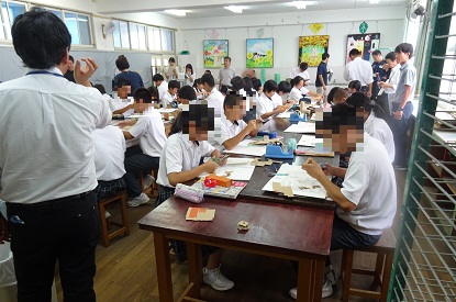 美術室(1年4組)でも研究授業が行われました。美術科では数年前から『食育』をテーマにした作品制作に取り組んでいます。本年度は身体にやさしいヤサイ&スイーツを段ボールという素材を使い、表面的な形のおもしろさで終わるのでなく、制作する過程の中で、何でこのヤサイを用いるのかという『こだわり』を大切にし、食の大切さを知らず知らずの間に少しずつ持たせていきたいと考えています。