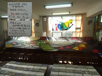 1階美術室では、「美術科、美術・文芸部」、1階被服室では、「家庭科、チャレンジ学級、家庭部」、1階音楽室では、「生徒会、学級応援旗」、廊下(2・3階 職員室前)では、「1年生学級別展示(なぞなぞボート)」、1階理科室では、「理科、理科部」、技術室では、「国語科、パソコン部、PTA」の作品を展示しました。