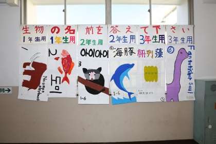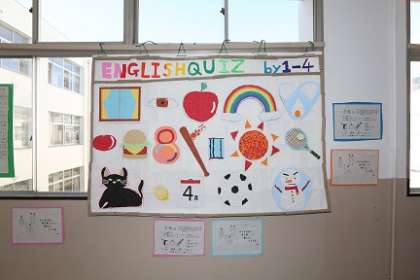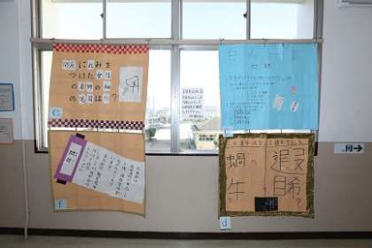 3階 職員室前廊下に展示した「1年生学級別展示(なぞなぞボート)」です。