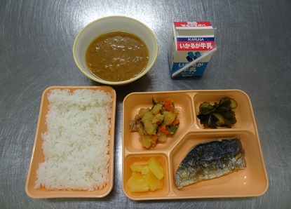 本日のメニュー:さごしの塩焼き、鶏肉とじゃがいもの煮もの、きゅう