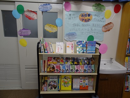 明日、10月27日(木)〜11月9日(水)は「読書週間」です。また、2年生が11月10日(木)と11日(金)の2日間は「職業体験」を行いますので、写真のように図書室入口付近に「お仕事フェアー」と称して、学校図書館補助員の稲生さんがコーナーを設置してくれました。
