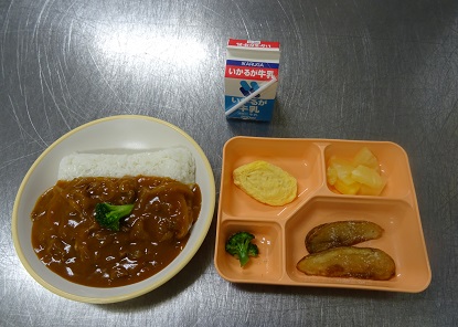 本日のメニュー:ハヤシライス・ブロッコリー、フライドポテト、