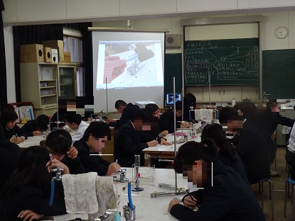 写真上段は、理科実験(炭酸水素ナトリュウムの分解)、中段は家庭科実習(出汁の摂り方)の様子です。