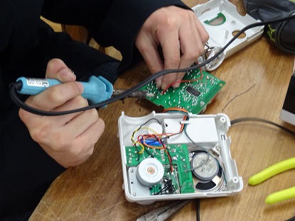 技術科の実習で、「ラジオ」を製作している様子です。生徒は「ハンダ」が中々うまくいかないようでした。しかし、完成してラジオが鳴るととても嬉しそうでした。