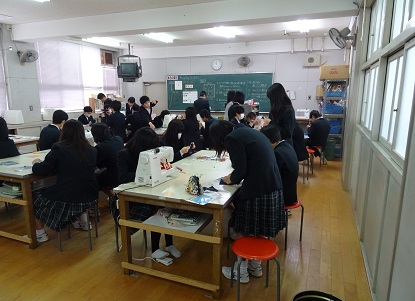 写真上段は、2年生の家庭科で「オリジナルコースターの作成」です。刺し子ししゅうをした表とバンダナ柄の裏地をミシンで縫い合わせている様子です。
