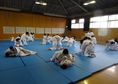 写真下段は、3年生女子の体育授業で柔道の寝技を行なっている様子です。