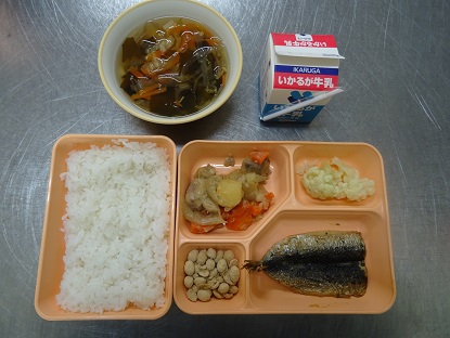 本日のメニュー:鰯のかば焼き、鶏肉とじゃがいもの煮もの、カリフ