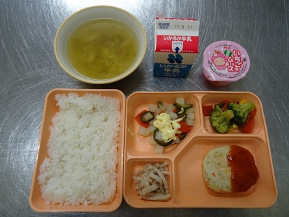 本日のメニュー:とうふハンバーグ、ポテトサラダ・ハム、ブロッ