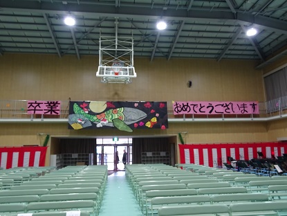 写真上段は、玄関を彩った美術文芸部の作品です。中段は卒業式会場に飾られた「くじら」のステンドグラスです。下段は、チャレンジ学級担任の製作です。