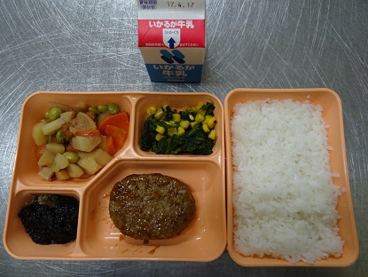 本日のメニュー:てり焼きハンバーグ、赤平天とじゃがいもの煮もの、
