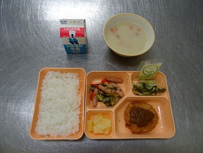 本日のメニュー:チキンカツ、ウインナーと野菜のソテー、キャベツと