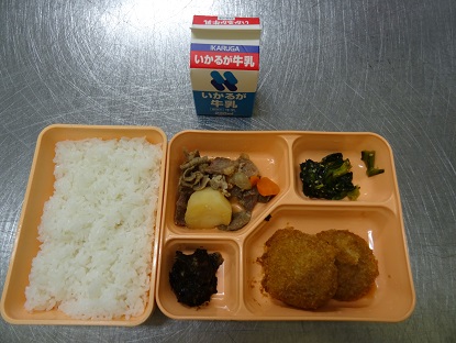 本日のメニュー:みそカツ、肉じゃが、小松菜のおひたし、