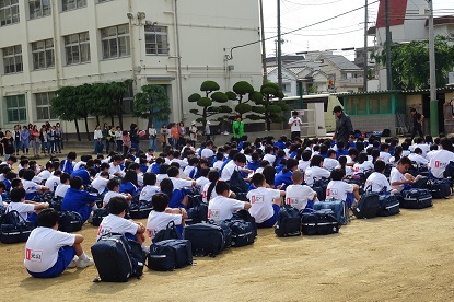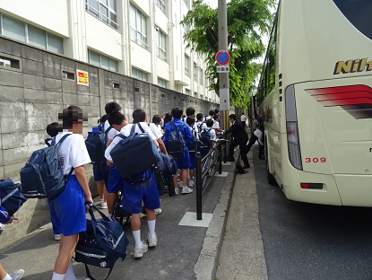 生徒たちは、運動場で「出発式」を行った後、9時10分に元気に出発しました。「一泊移住」は、5月21日(日)〜22日(月)に和歌山県日高郡にある「堺市立日高少年自然の家」で行われます。自然の中での活動を通じて、学級や班の中で協力して活動することにより、より良い仲間づくりをして欲しいと思っています。