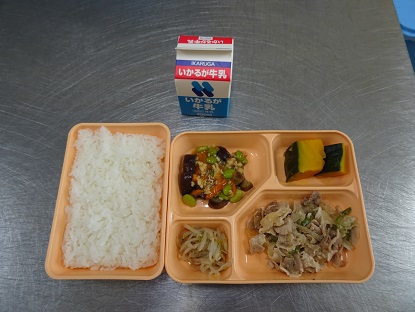 本日のメニュー:豚肉の甘辛煮、焼きなすのそぼろあんかけ、かぼちゃ