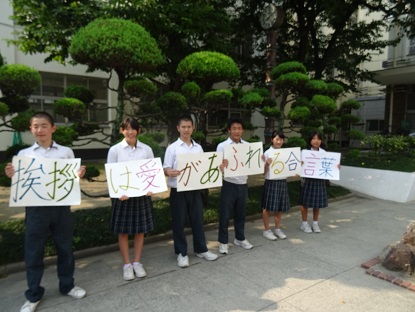 登校指導強調週間に合わせて、生徒会執行部のメンバーがスローガンを手に朝のあいさつ運動を展開してくれています。