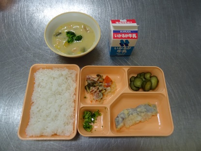 本日のメニュー:かぼちゃのクリームシチュー・ブロッコリー、白身