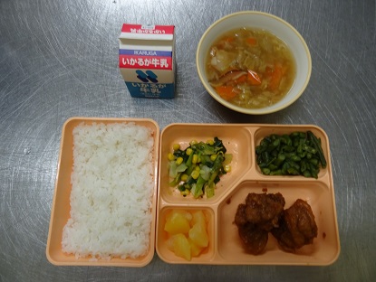 のピリ辛あえ、パインアップル缶詰、米飯、牛乳