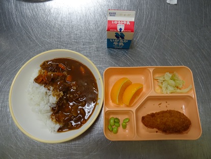 本日のメニュー:ハヤシライス・枝豆、白身魚フライ、キャベツの